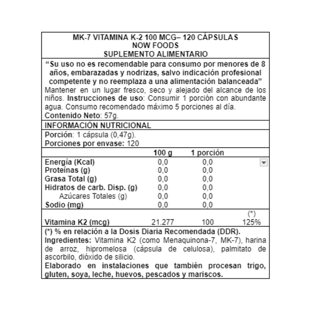 Mk-7 Vitamina K2 100 Mcg, 120 Veg Caps, Now Foods, Producto Americano